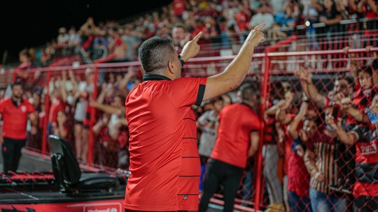 Técnico do Atlético-GO celebra muito o gol no final do jogo